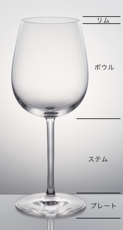 その前に説明しやすいようにワイングラスの各部分の名称をお伝えしておきます。