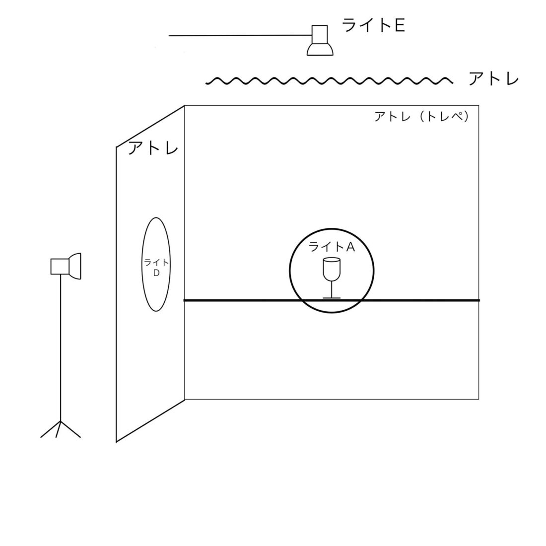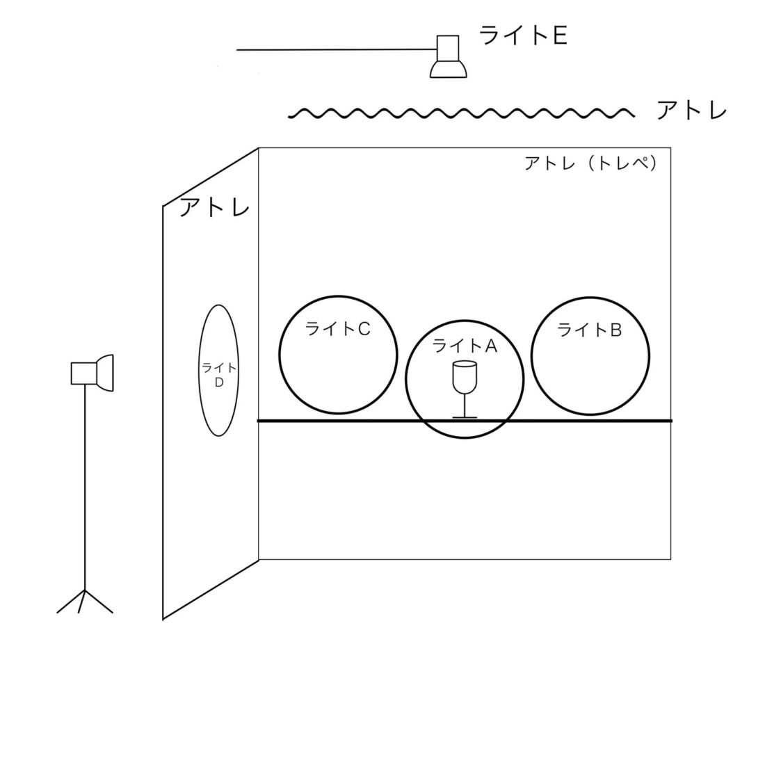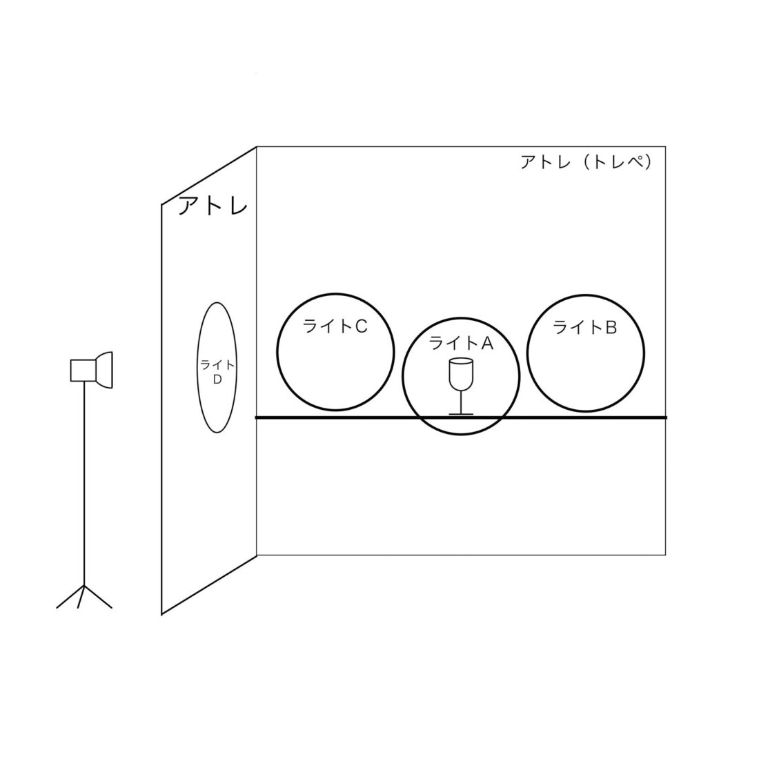 イラストでは真横にライトがある様に見えますが実際にはグラスとカメラのライン45°の位置 アトレ越しに置きました。
