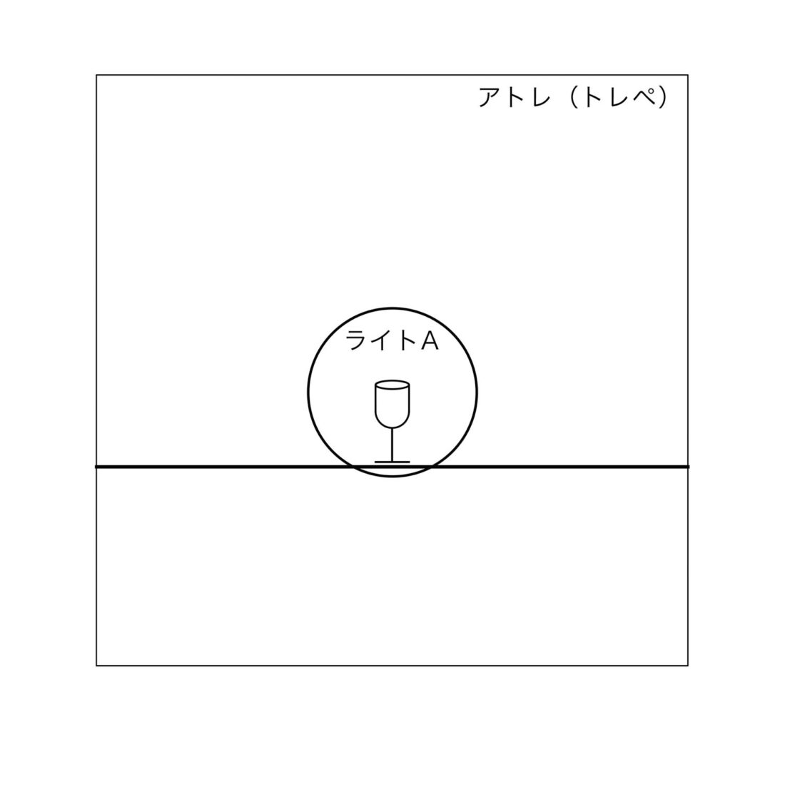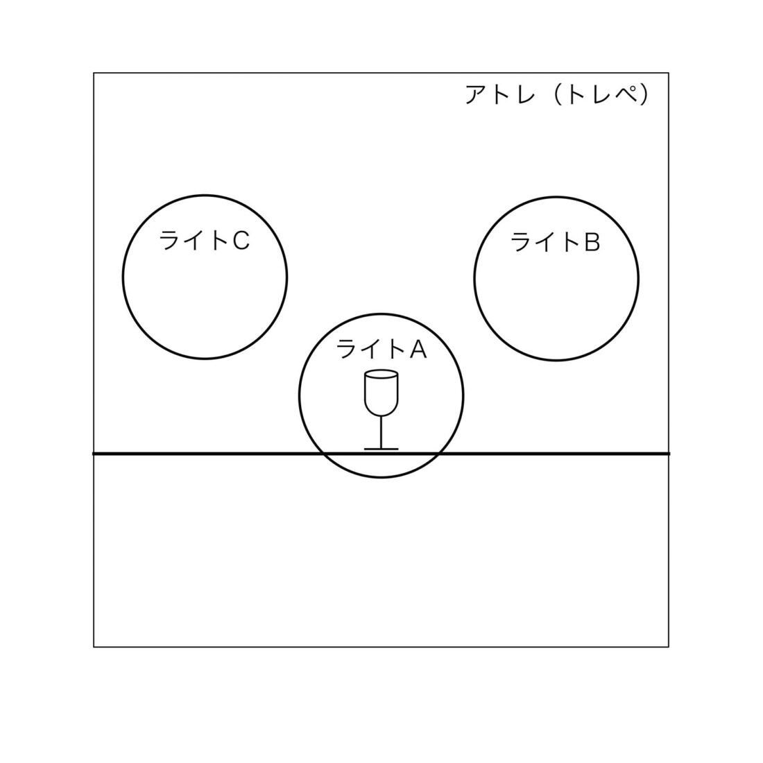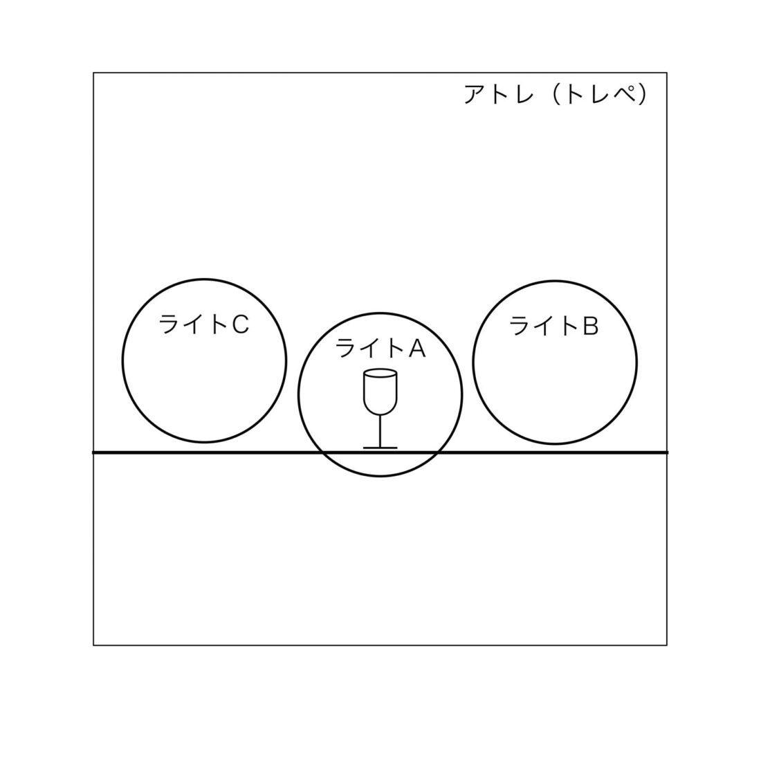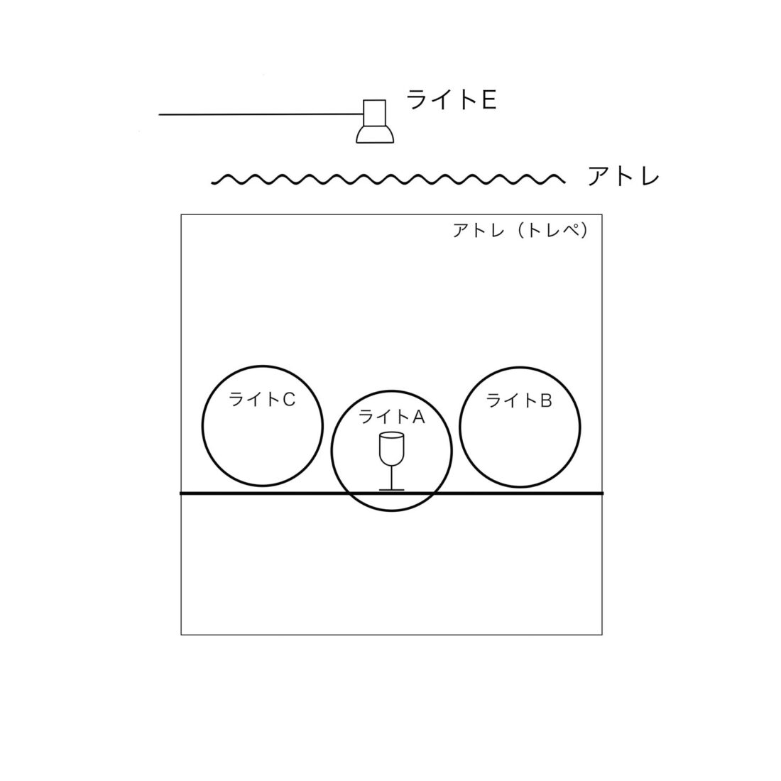 イラストでは真横にライトがある様に見えますが実際にはグラスとカメラのライン45°の位置 アトレ越しに置きました。