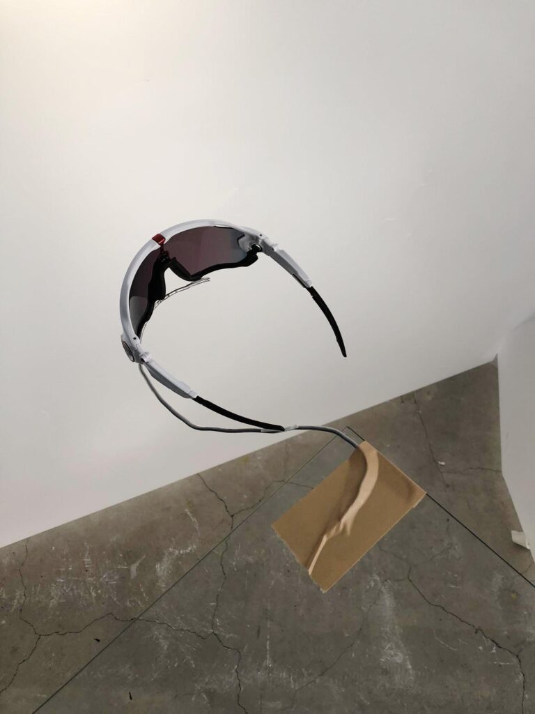 回りが写り込まないよう少し固めの針金で宙に浮かせます。眼鏡の下に両面テープで固定。