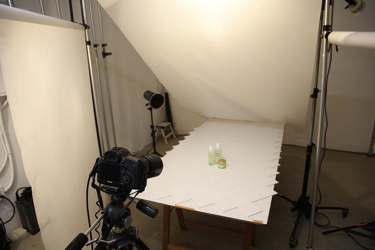 スタジオ内に背景や小物を組み、自然光のようなやわらかい印象を作ることで、清潔感や生活の中になじむ雰囲気を表現できます。