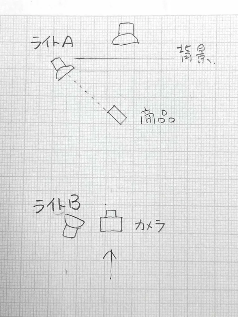 上記の作例から考えるとライトBが正面すぎていて商品にまともに光がうけているように感じます。