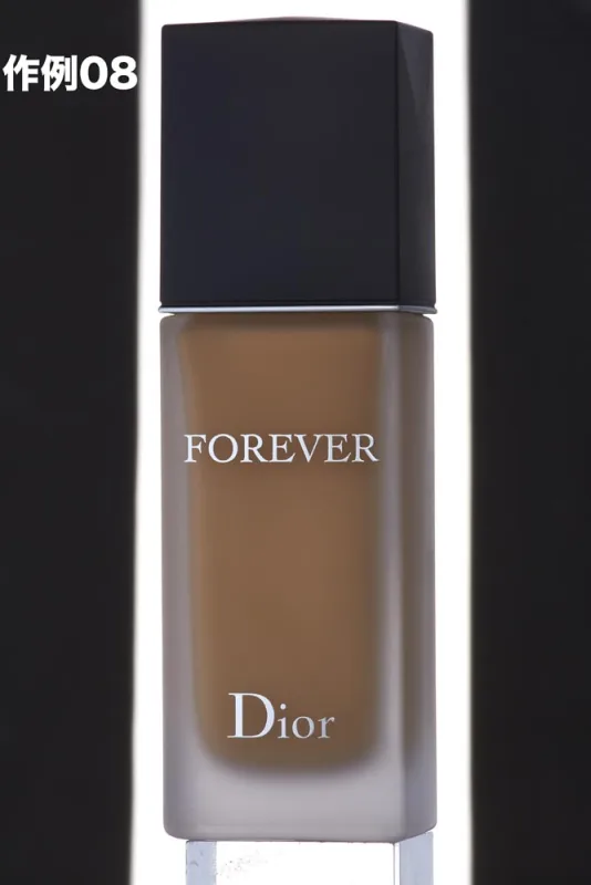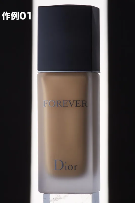 - 作例08 ライトAを点けてみましょう。ライトBの1/4の出力です。ファンデーションの角にハイライトが戻りました。左側のロゴもいい感じに出てきました。もう少し明るい方が良さそうです。
