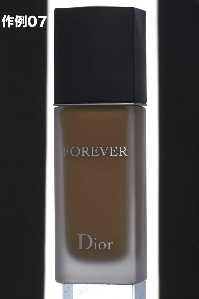 - 作例08 ライトAを点けてみましょう。ライトBの1/4の出力です。ファンデーションの角にハイライトが戻りました。左側のロゴもいい感じに出てきました。もう少し明るい方が良さそうです。