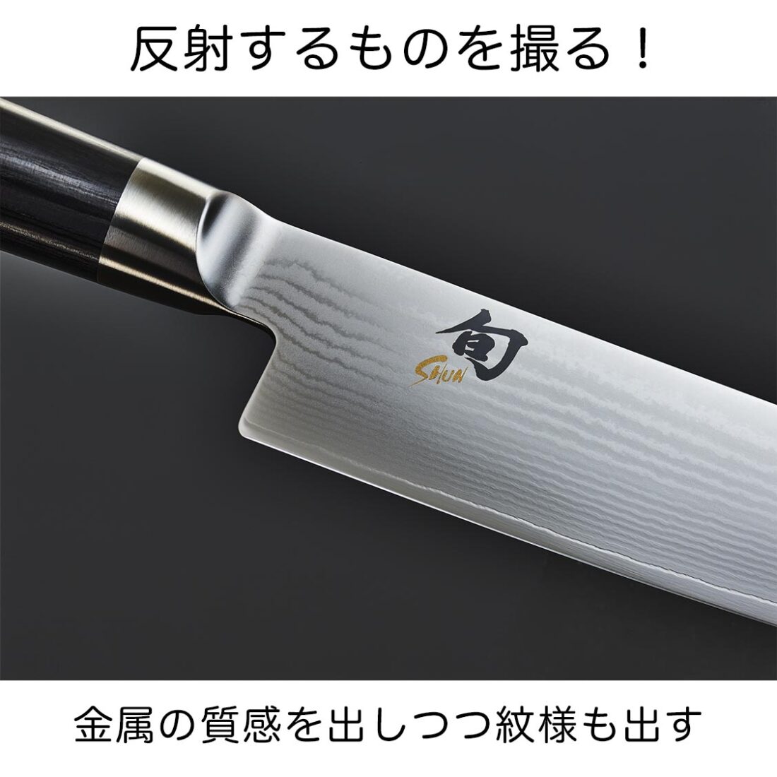 反射するものやホットスタンプのロゴ部分の描写など適切なプロップや背景を選び、商品の魅力を最大限に発揮するスタイリングを行う