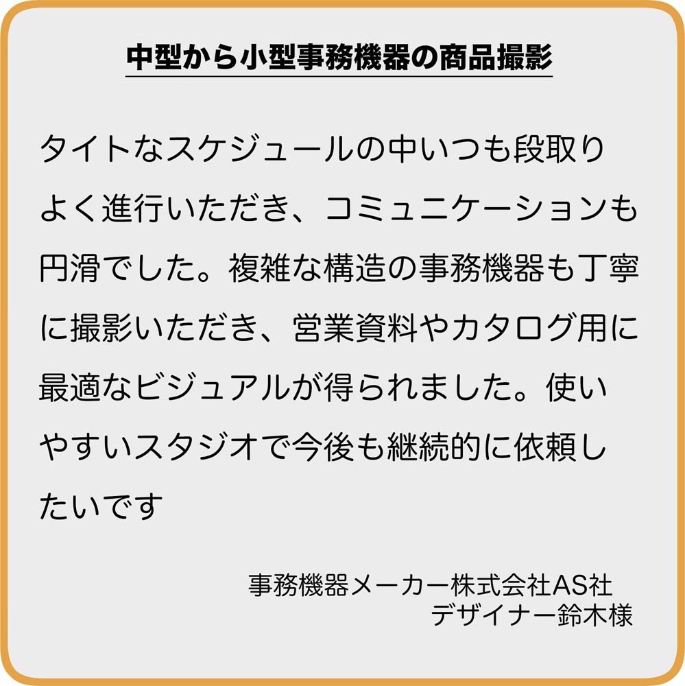 撮影クオリティと効率のバランスは、お客様のご要望に応じて柔軟に対応いたします。 効率優先撮影(反射のない商品はこちらでご対応)より多くの商品を短時間で撮影できます。 撮影事例 ノートパソコンの撮影で約1時間半で様々な角度から20カット撮影 事務機器シュレッダーなど2時間で30カット撮影 高精度撮影(反射や写り込みの多い商品を丁寧に調整して撮影):表現力の高い高品質な商品画像が得られますが、撮影可能点数は効率優先撮影より限られます。 画像処理などある場合は別料金となります。撮影商品 撮影内容カット数 をお伝えください。 するであろう画像処理と大体の撮影時間を元にお見積もりいたしますのでご相談ください。 撮影時間は確約するものではございません。 | 反射する商品やホットスタンプのロゴの処理 切り抜き背景処理などは別料金となります。 ご依頼手順 ・メールまたは電話で撮影内容 点数をお知らせください。 ・お見積もりを提示いたしますご承諾致しましたら弊社宛に商品をお送りください。 ・撮影いたします。 ・撮影いたしましたらPDFで確認用の撮影画像をお送りいたします。 ・大丈夫でしたらご指定のファイル形式で納品いたします。 |