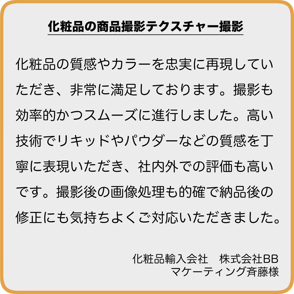 画像処理 切り抜きなどある場合は別料金となります。 化粧品の撮影は商品の撮影だけではなく商品のテクスチャーやシズル感 イメージ撮影などあり撮影時間内でしたら様々な撮影を行います。 イメージ撮影に関しましては弊社に背景や小物などございますのでそちらを無料でお使いいただけます。 ハイブランドなどの撮影は料金が変わる可能性がございます見積もりいたしますのでお気軽にお尋ねください | 反射する商品やホットスタンプのロゴの処理 切り抜き背景処理などは別料金となります。 ご依頼手順 ・メールまたは電話で撮影内容 点数をお知らせください。 ・お見積もりを提示いたしますご承諾致しましたら弊社宛に商品をお送りください。 ・撮影いたします。 ・撮影いたしましたらPDFで確認用の撮影画像をお送りいたします。 ・大丈夫でしたらご指定のファイル形式で納品いたします。 |