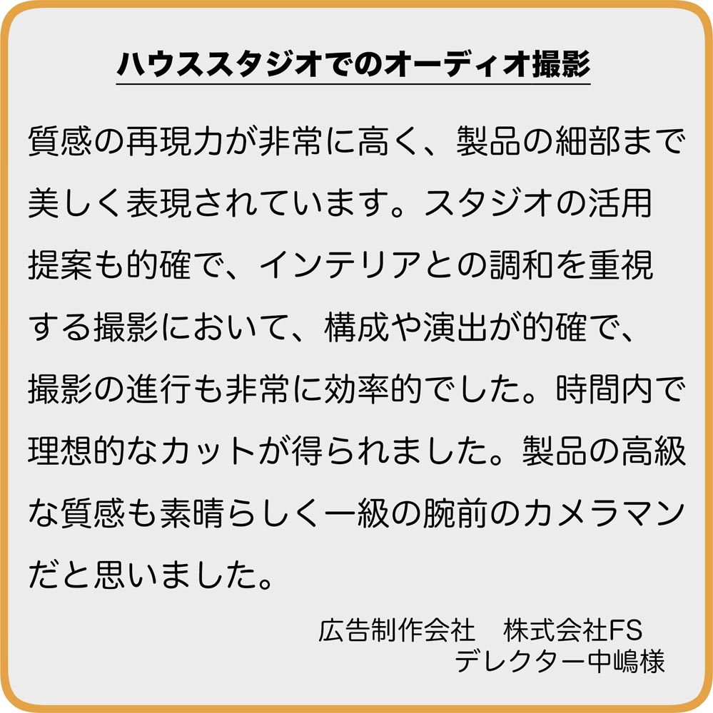 基本料金2時間から ¥44,000税込 延長料金20分¥6,600税込 | 高精度撮影(反射や写り込みを丁寧に調整) 1カット¥8,800税込 効率優先撮影(多少の写り込みを許容) 1カット¥4,400税込 |