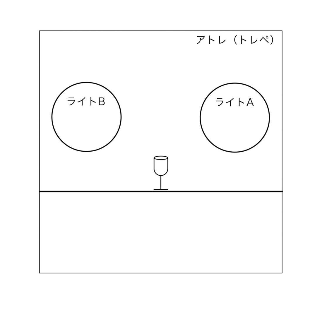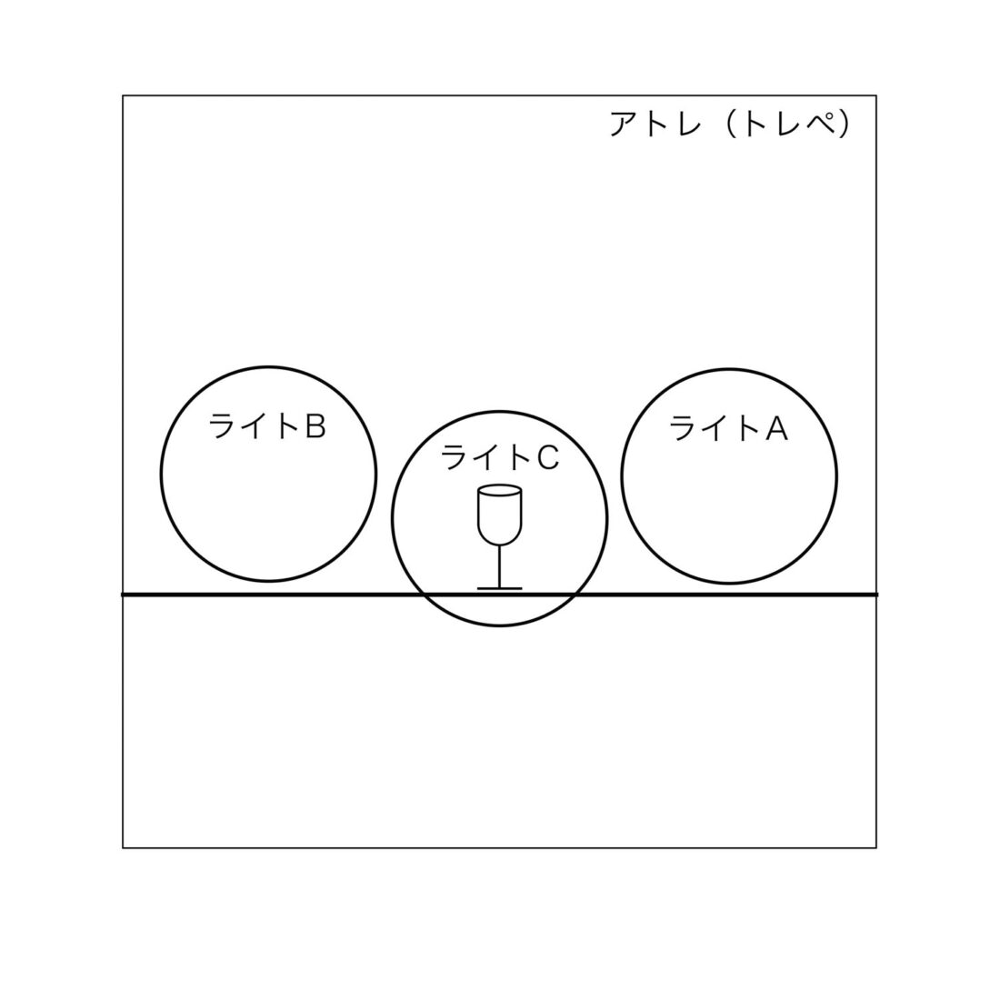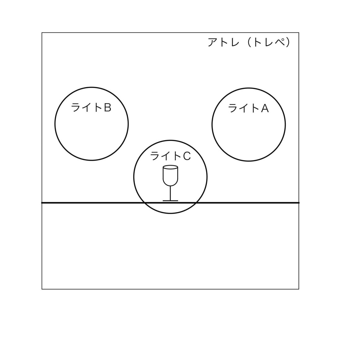 イラストでは真横にライトがある様に見えますが実際にはグラスとカメラのライン45°の位置 アトレ越しに置きました。